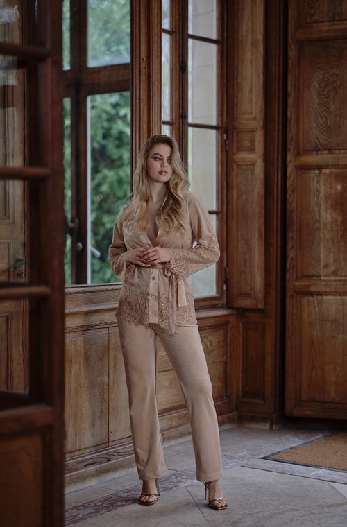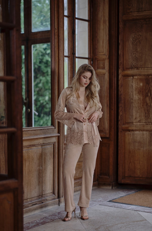 Immerse yourself in a world where shadow and light meet, where each piece reveals a fluid and poetic sensuality. The ÉCLIPSE collection invites you to discover creations in silk satin, floral embroidery, and delicate lace, fusing comfort and elegance. Every gesture, every detail, tells the story of a luminous femininity, suspended between dream and awakening.
