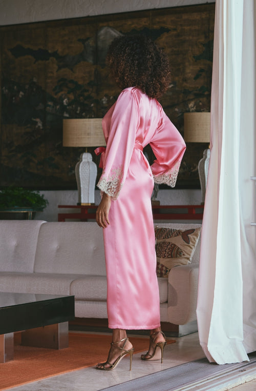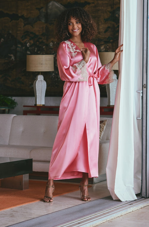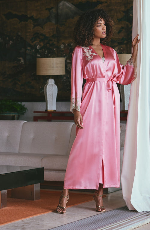 A silk negligee for a soft and luxurious feel, with the fullness of its majestic sleeves echoing the shapes of old-fashioned kimonos offering a sophisticated interior look. These modern pieces with a perfect look are available in a range of colours and patterns to suit all tastes, making these dressing gowns a distinguished choice for any occasion.