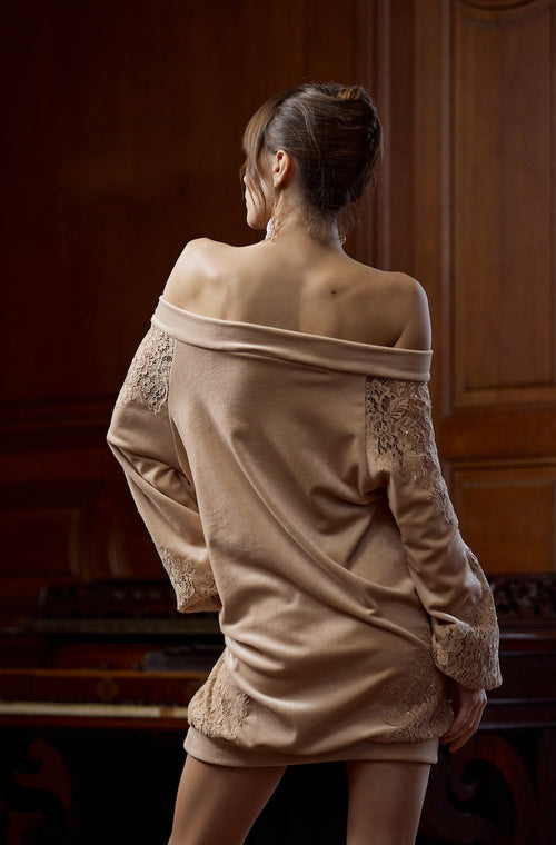 Beige velvet off-the-shoulder short dress Peau