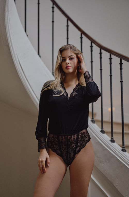 Body à manches longues Valéria en maille soie et dentelle noire Noir