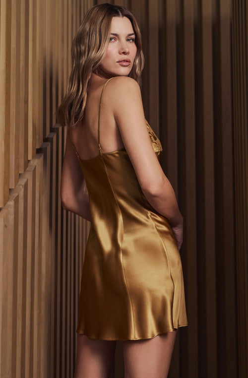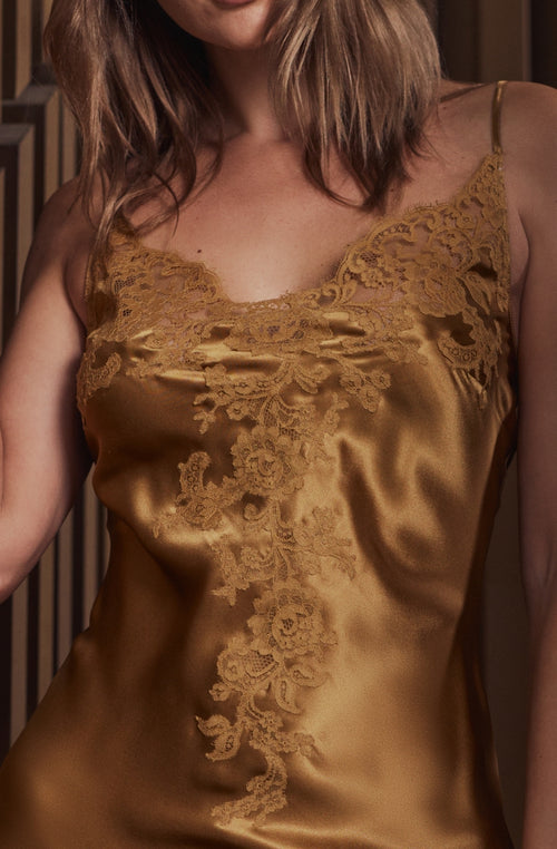 Combinette Bénédicte en soie et au décolleté brodé de dentelle noisette Noisette