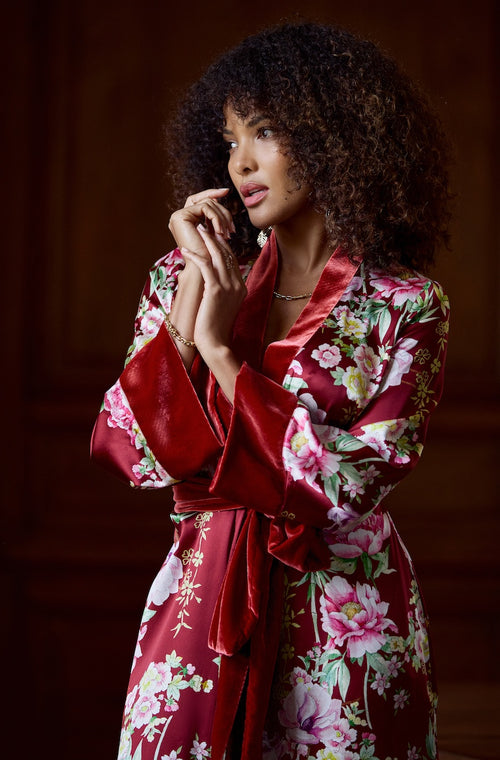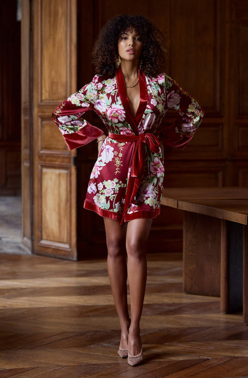 Déshabillé court Velvet en satin de soie aux finitions velours Imprimé bourgogne