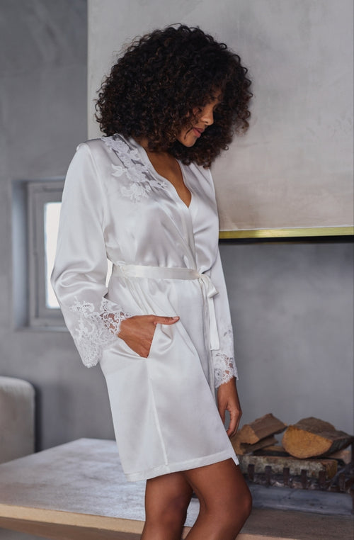 Déshabillé court Bénédicte en soie et dentelle blanche Naturel