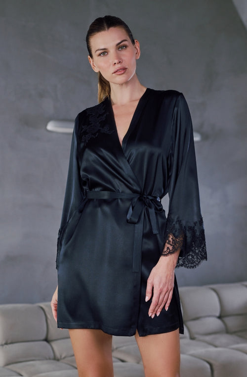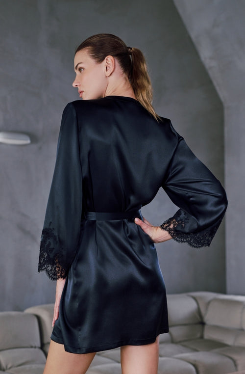 Déshabillé court Bénédicte en soie et dentelle noire Noir