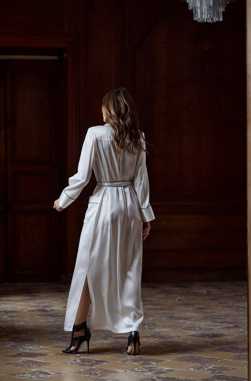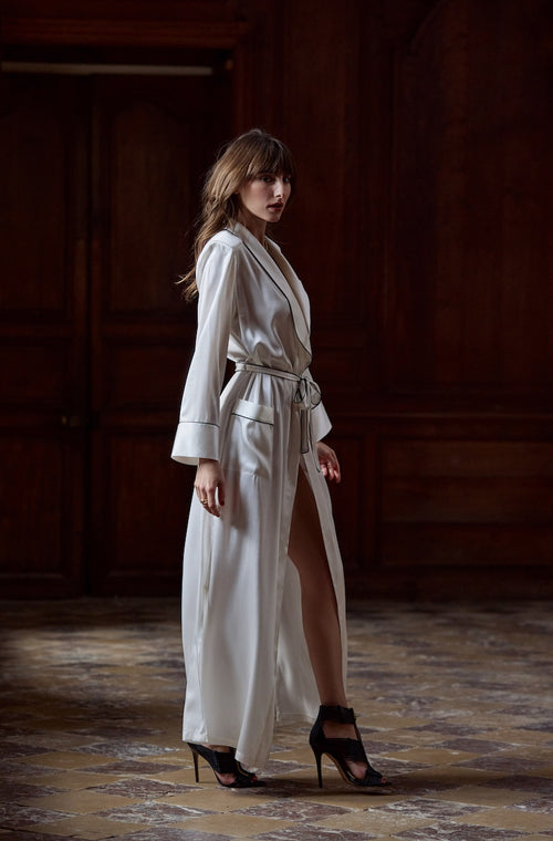 Déshabillé long Valéria en satin blanc Naturel / Noir