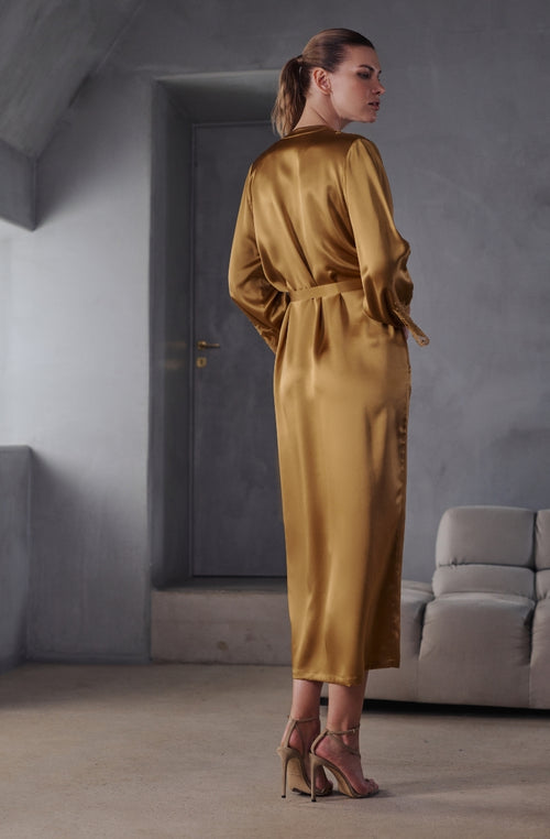 Déshabillé long Bénédicte en soie et dentelle noisette Noisette