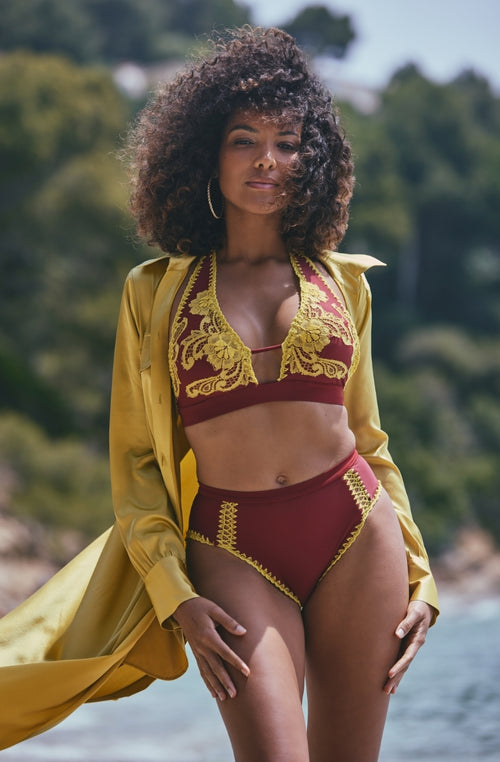 Ce qui distingue vraiment la collection de hauts de maillots de bain Marjolaine, ce sont les finitions et les détails de haute couture qui rendent chaque modèle exceptionnel. Les bretelles sont ajustables et souvent ornées de bijoux métalliques dorés ou de finitions satinées qui créent une texture visuellement captivante. Certains modèles sont embellis de broderies délicates, qui apportent un effet de texture et de relief, créant une richesse visuelle qui attire le regard.