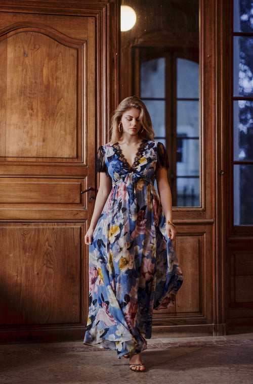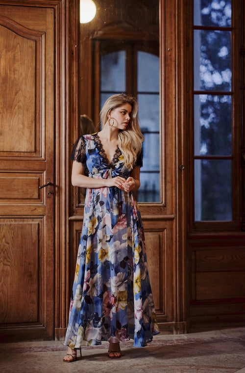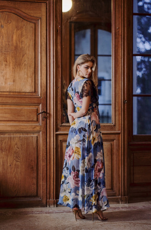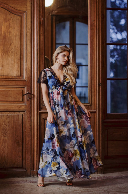 Nuisette longue Velvet en mousseline de soie et dentelle Imprimé bleu