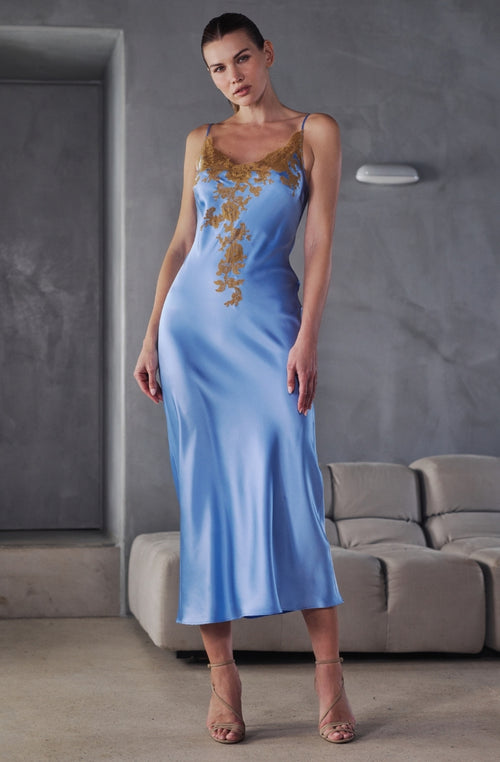 Nuisette longue Bénédicte en soie bleue et au décolleté bordé de dentelle noisette Ciel / Noisette