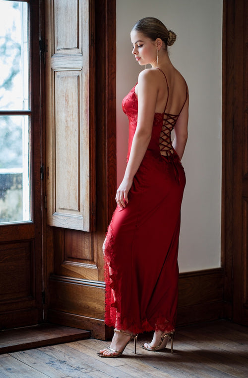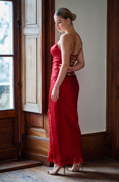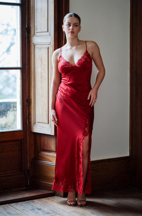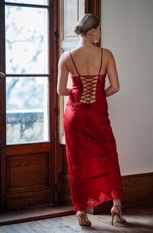 Nuisette longue sexy Velvet en soie et dentelle rouge Bourgogne