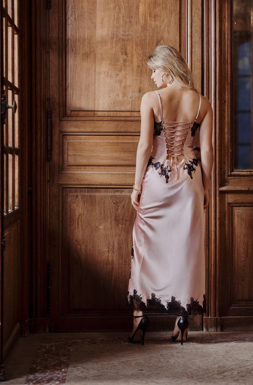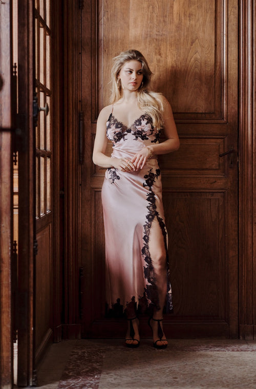 Nuisette longue sexy Velvet en soie rose et dentelle Pétale / Noir