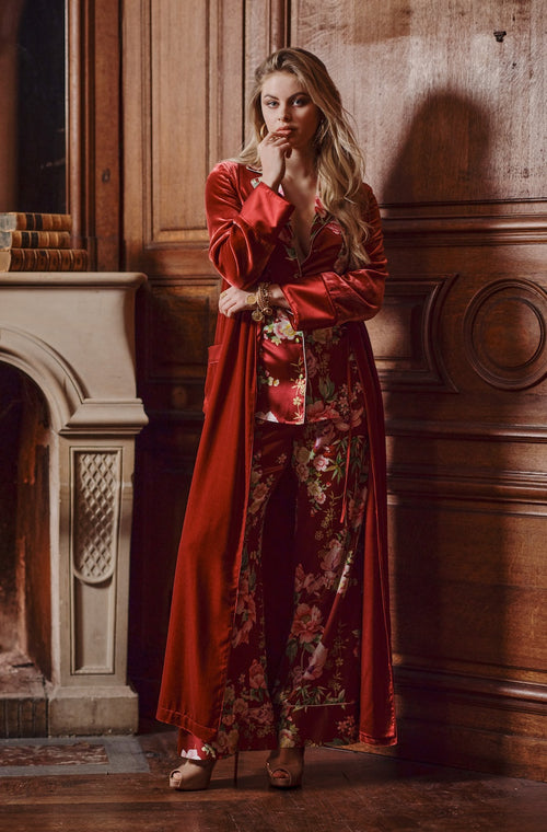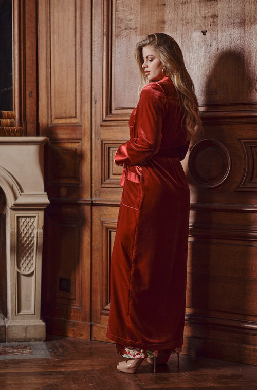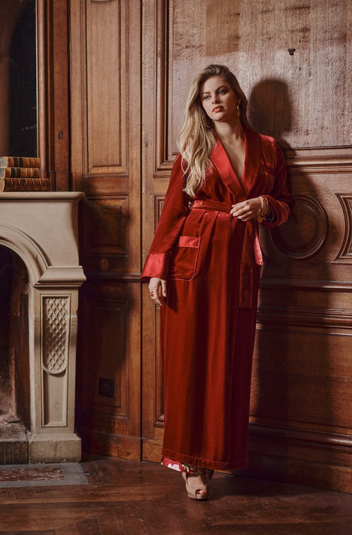 Peignoir long Velvet en velours rouge doublé de soie Bourgogne