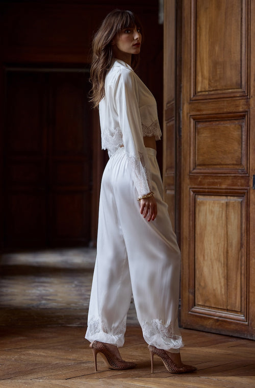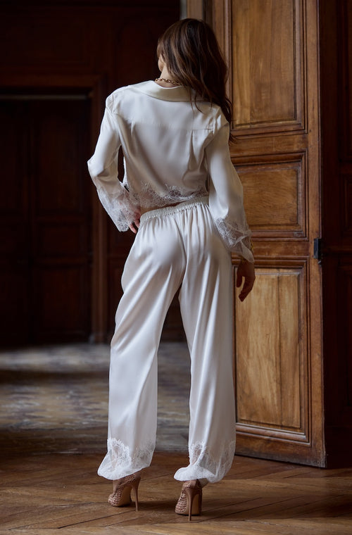 Top court façon chemise Valéria en satin et dentelle blanche Naturel